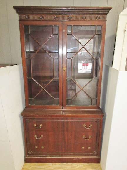 Albrecht Auctions Antique Dark Wood Tall China Cabinet With Glass Doors And Three Bottom Storage Drawers